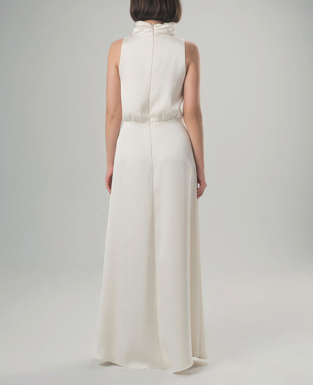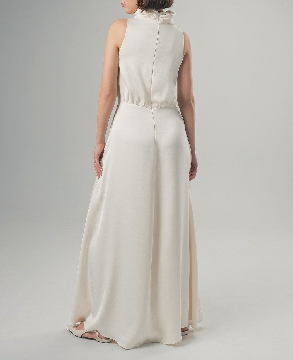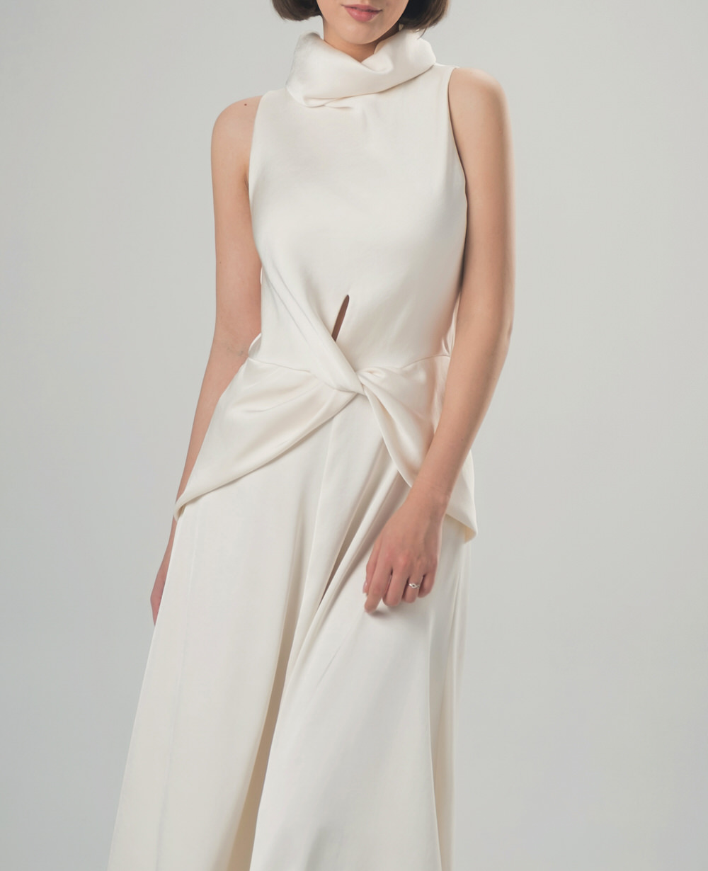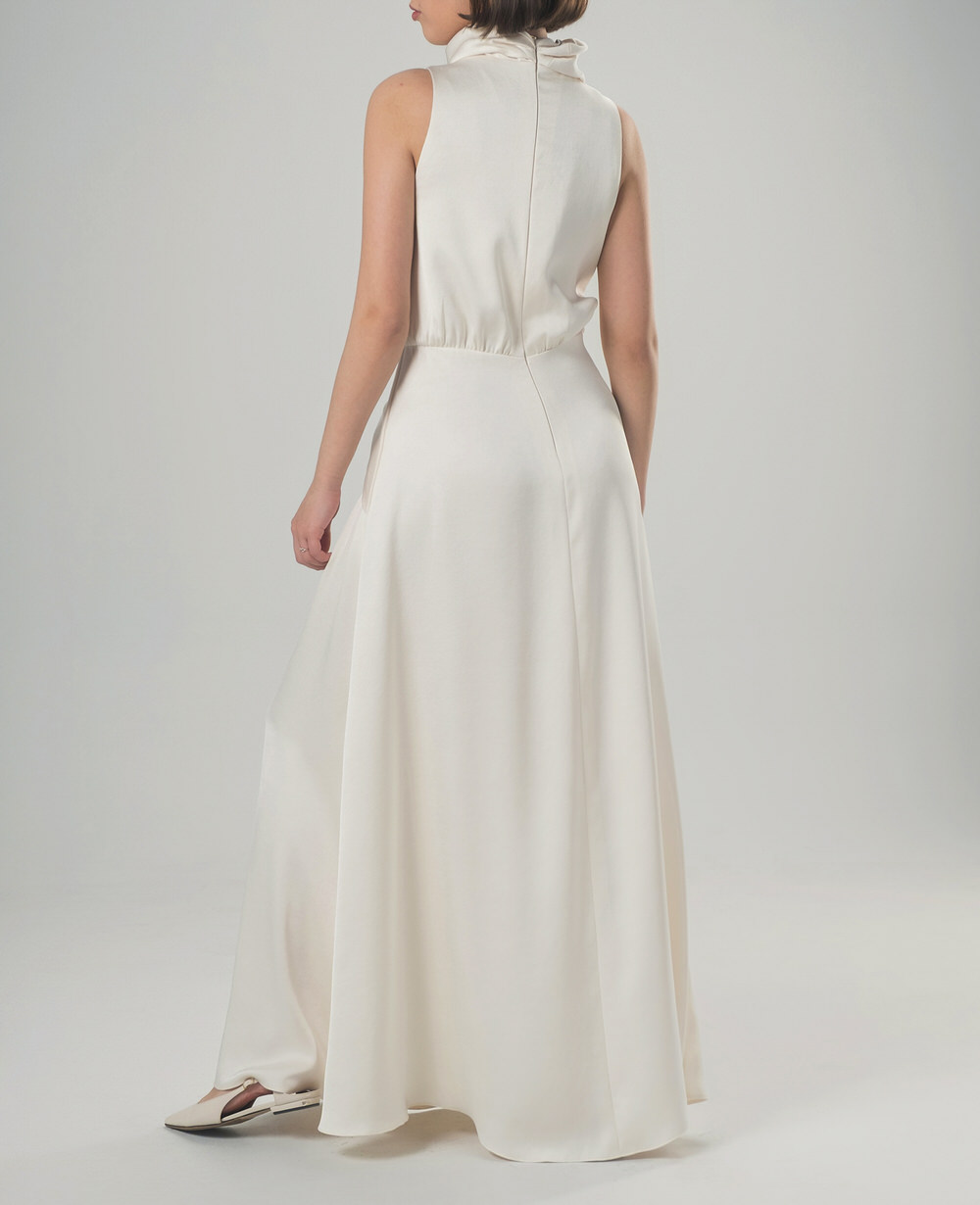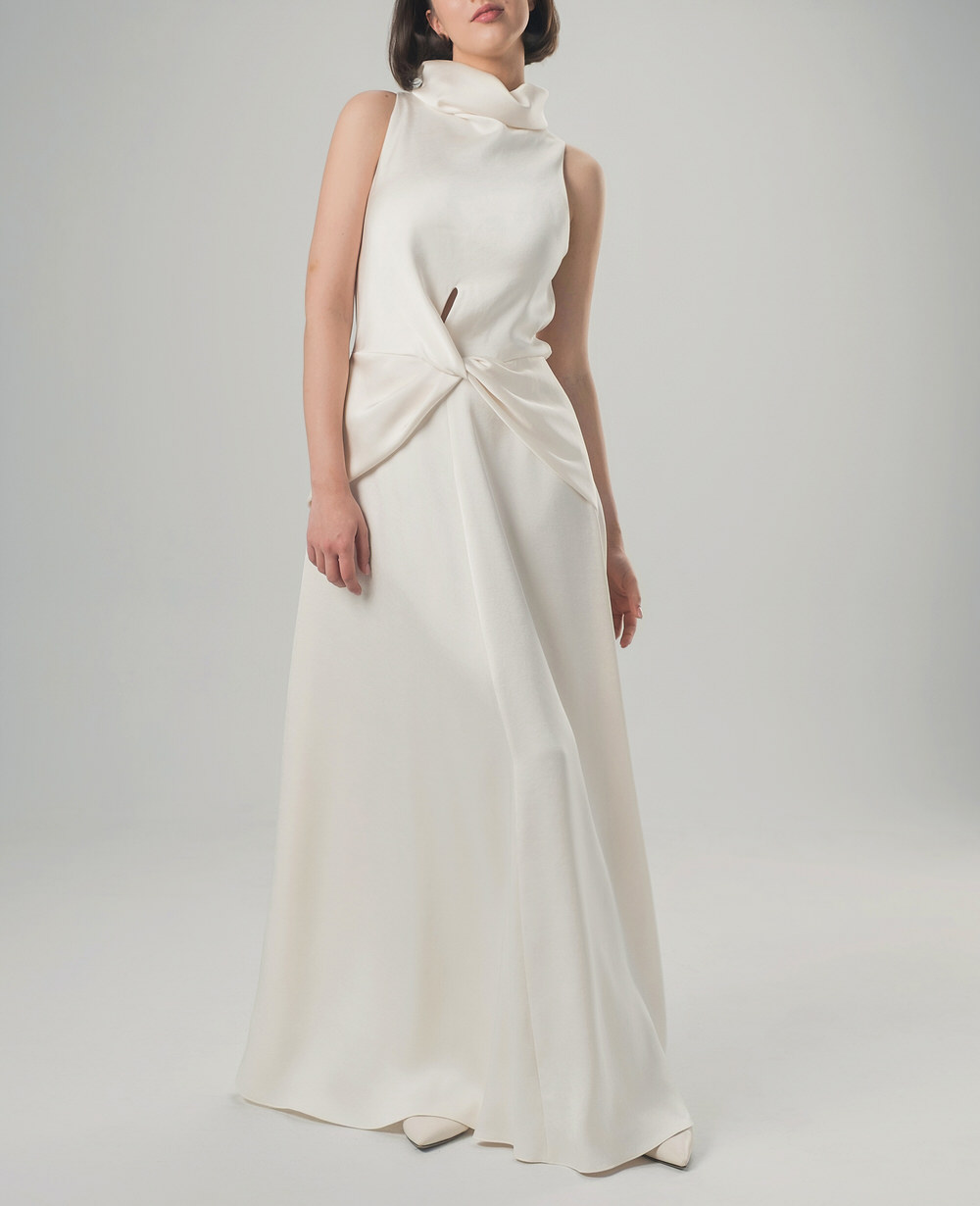 An ode to sculpted elegance, this off-white gown from TN Couture’s WE Collection flows in quiet confidence. The softly draped turtleneck and artfully gathered waist introduce texture and depth, while the front slit reveals a hint of movement. Defined by fluid lines and architectural poise, it is a dress made for presence without excess—refined, effortless, and composed. Fits true to Italian sizing-take your regular size. The model is 175 cm tall and is wearing IT 40.